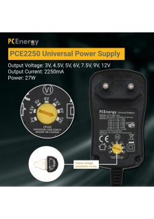 À l’aide de la clé fournie, régler la tension de sortie sur le commutateur rotatif sur 7 niveaux différents (3V, 4,5V, 5V, 6V, 7,5V, 9V, 12V). Avec un courant de sortie de 2,25 A, il délivre une puissance maximale de 27 W.