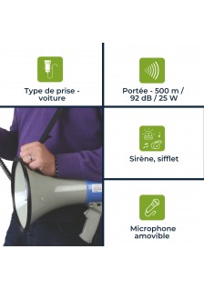 Mégaphone avec bandoulière, 25 W, 500 m, sirène, fonction vocale, sifflet, micro déporté.