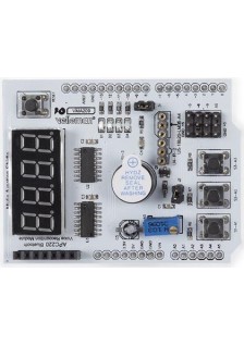 Découvrez la carte d'extension multifonction pour Arduino® : un accessoire puissant équipé d'un affichage 4 chiffres à 7 segments, de leds SMD lumineuses, de boutons poussoirs et de différentes interfaces telles que DS18B20 et LM35.