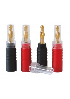 Blister de 4 fiches bananes - goupille à ressort - (2 rouges, 2 noires) haut de gamme avec capot de protection.