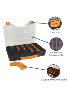 Cette boîte vous permet d'avoir toujours votre matériel à portée de main. Les compartiments permettent le rangement de pièces et d'accessoires de petite taille telles que les vis, les clous, les chevilles, les écrous, etc.