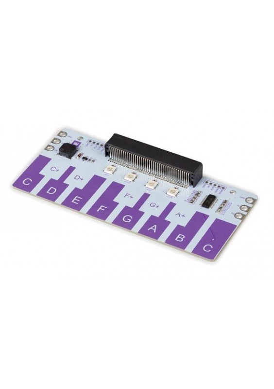 Le shield dispose de 13 touches de piano sensitives (1 octave, incluant les demi-tons et tons entiers), d'un buzzer et de 4 LEDs RGB. Le micro:bit® peut être facilement connecté au shield via le connecteur edge inclus. Aucune vis ou câble nécessaire !
